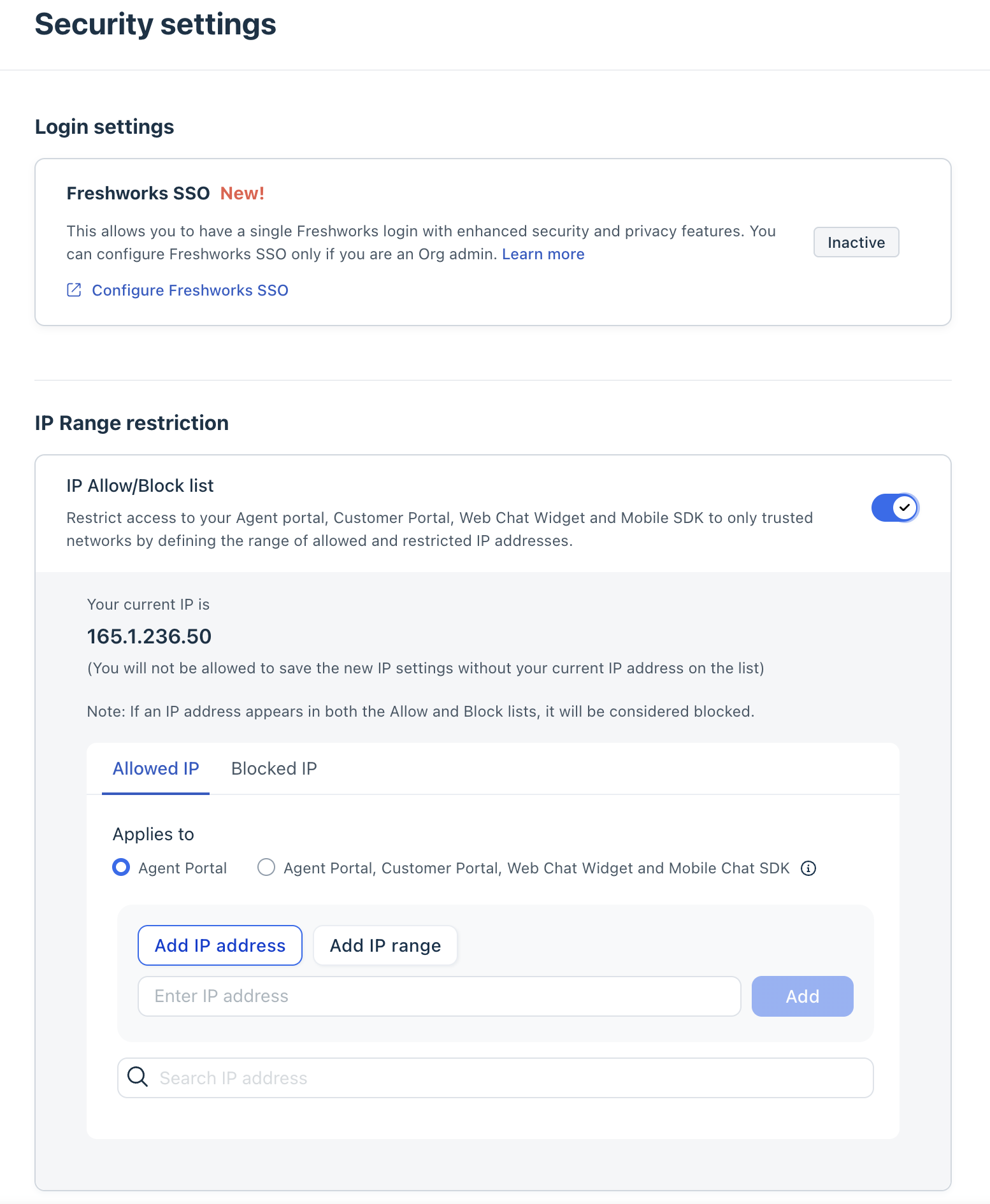 Additionally, Freshdesk includes safeguards to prevent you from blocking your own IP address and sends email notifications whenever configuration changes are made.