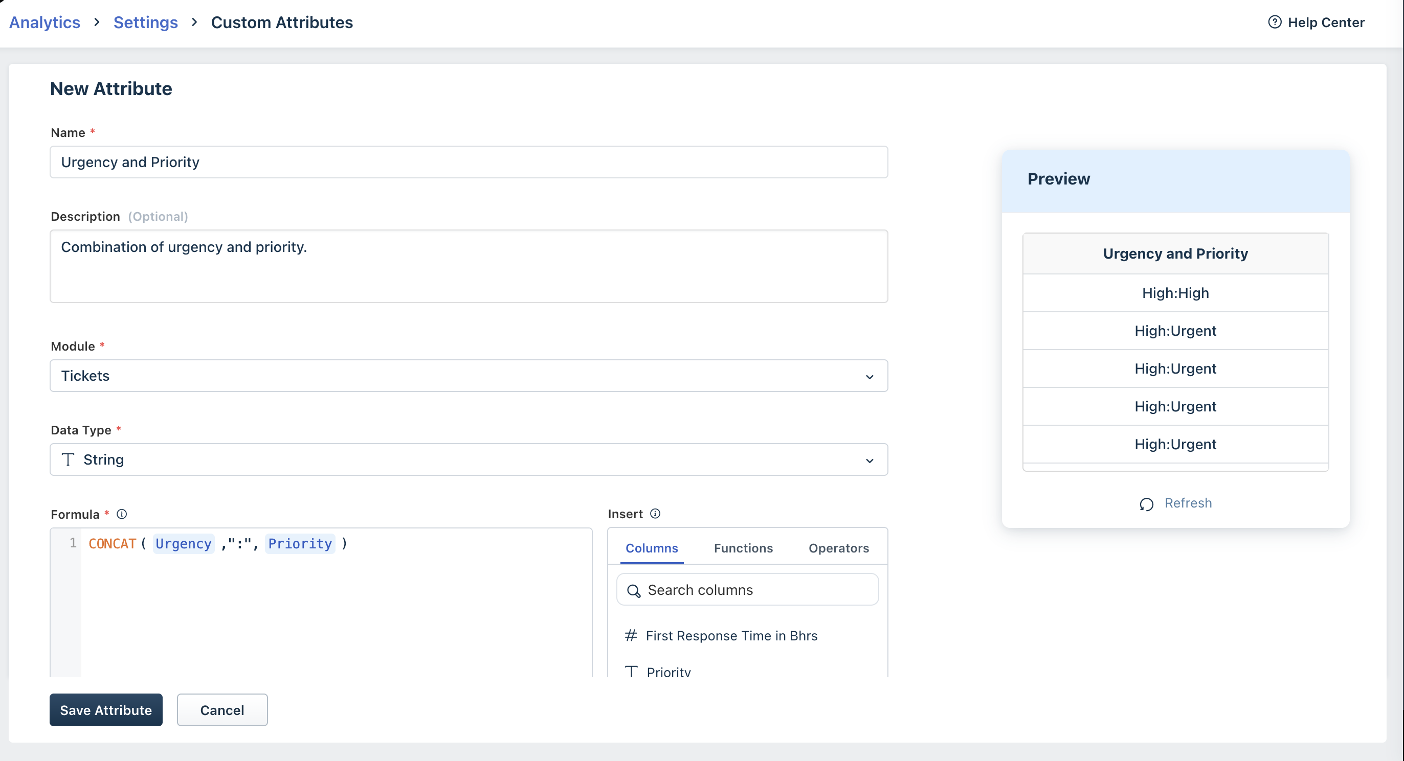 Let's say you want to create a new custom attribute that's a combination of ticket urgency and ticket priority. Perform the following steps to create this custom attribute.