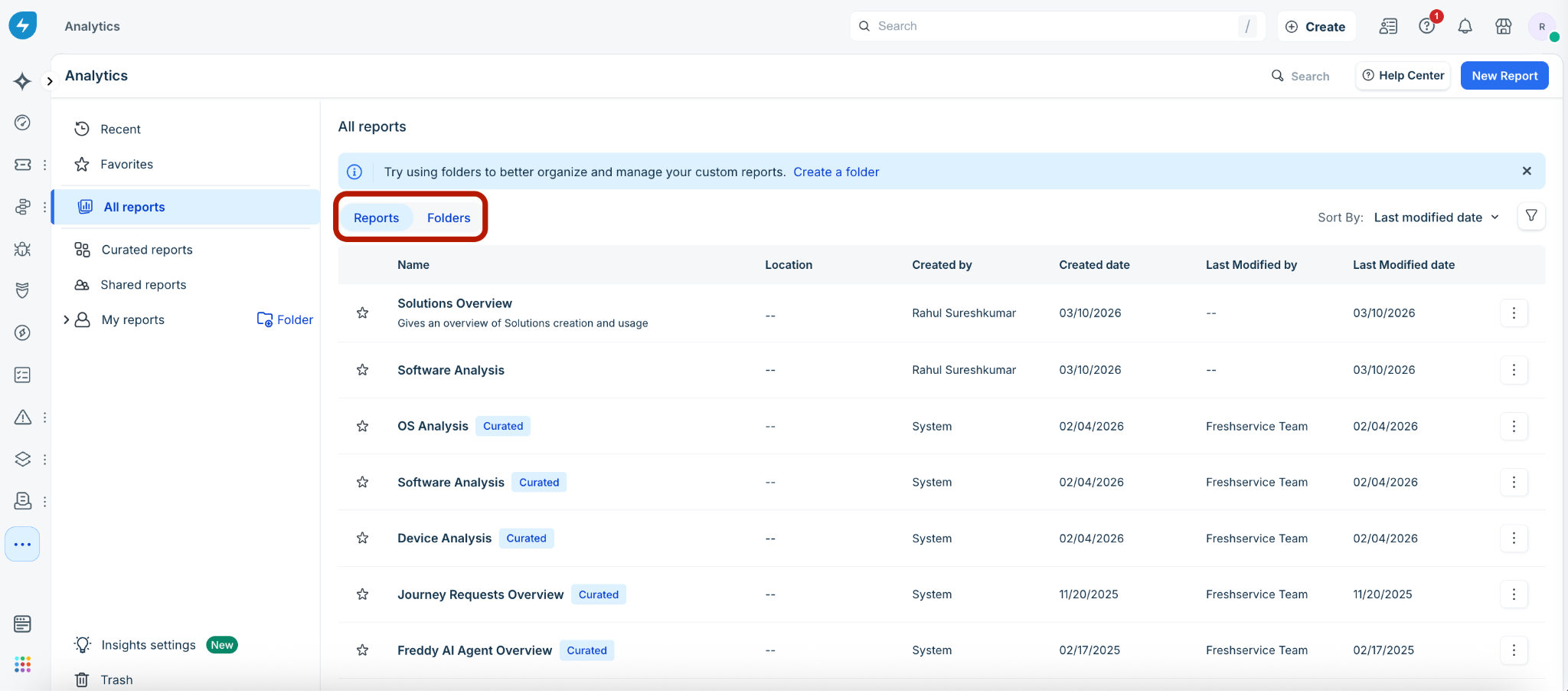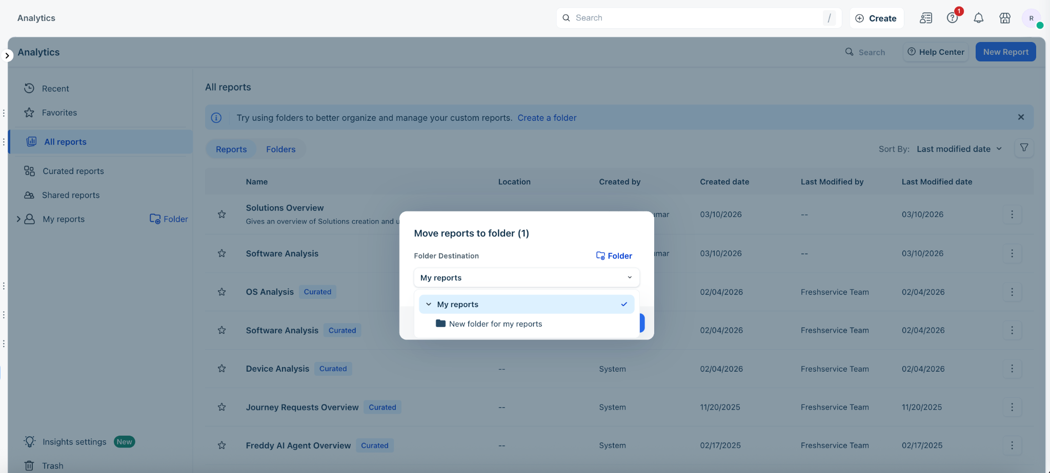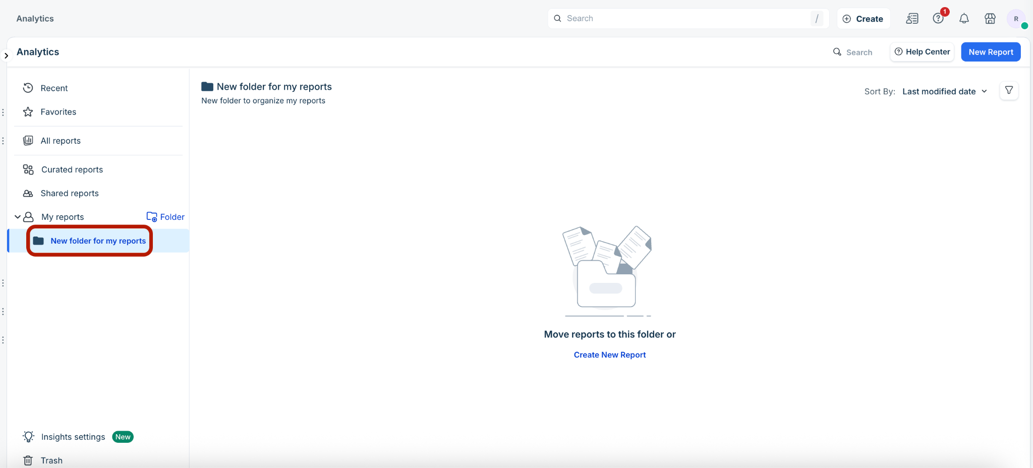 Analytics now features folder management for custom reports, enabling you to better organize your reports. You can create up to 30 private folders to categorize your My Reports view, providing a clean, flat hierarchy for easier navigation. Whether you need to group reports by project, department, or frequency of use, folder structures ensure your most important reports are quickly accessible.