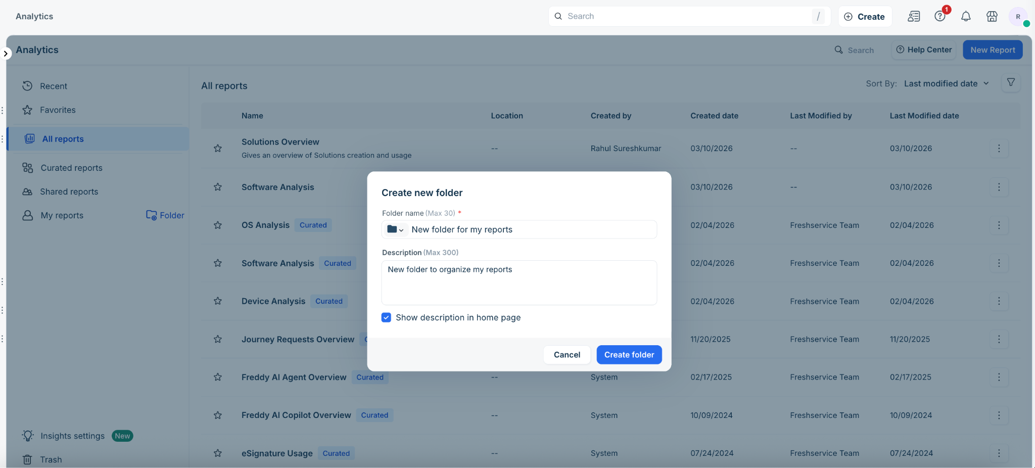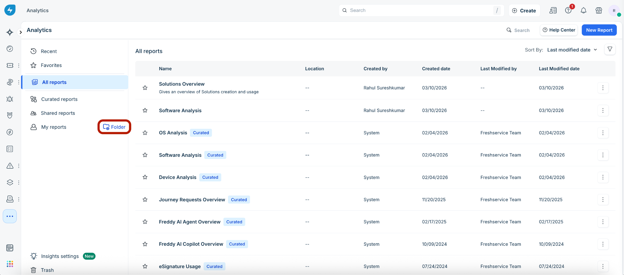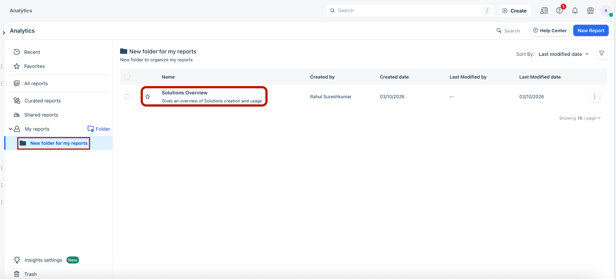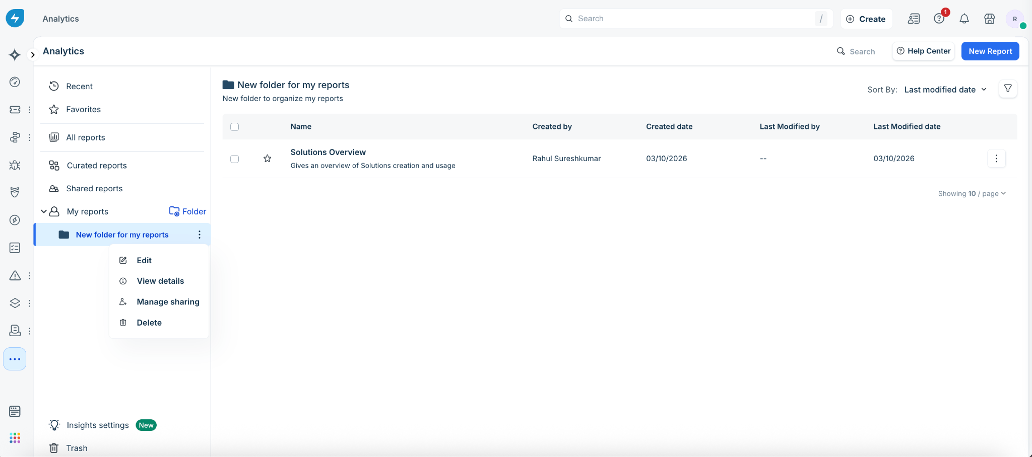 Analytics now features folder management for custom reports, enabling you to better organize your reports. You can create up to 30 private folders to categorize your My Reports view, providing a clean, flat hierarchy for easier navigation. Whether you need to group reports by project, department, or frequency of use, folder structures ensure your most important reports are quickly accessible.