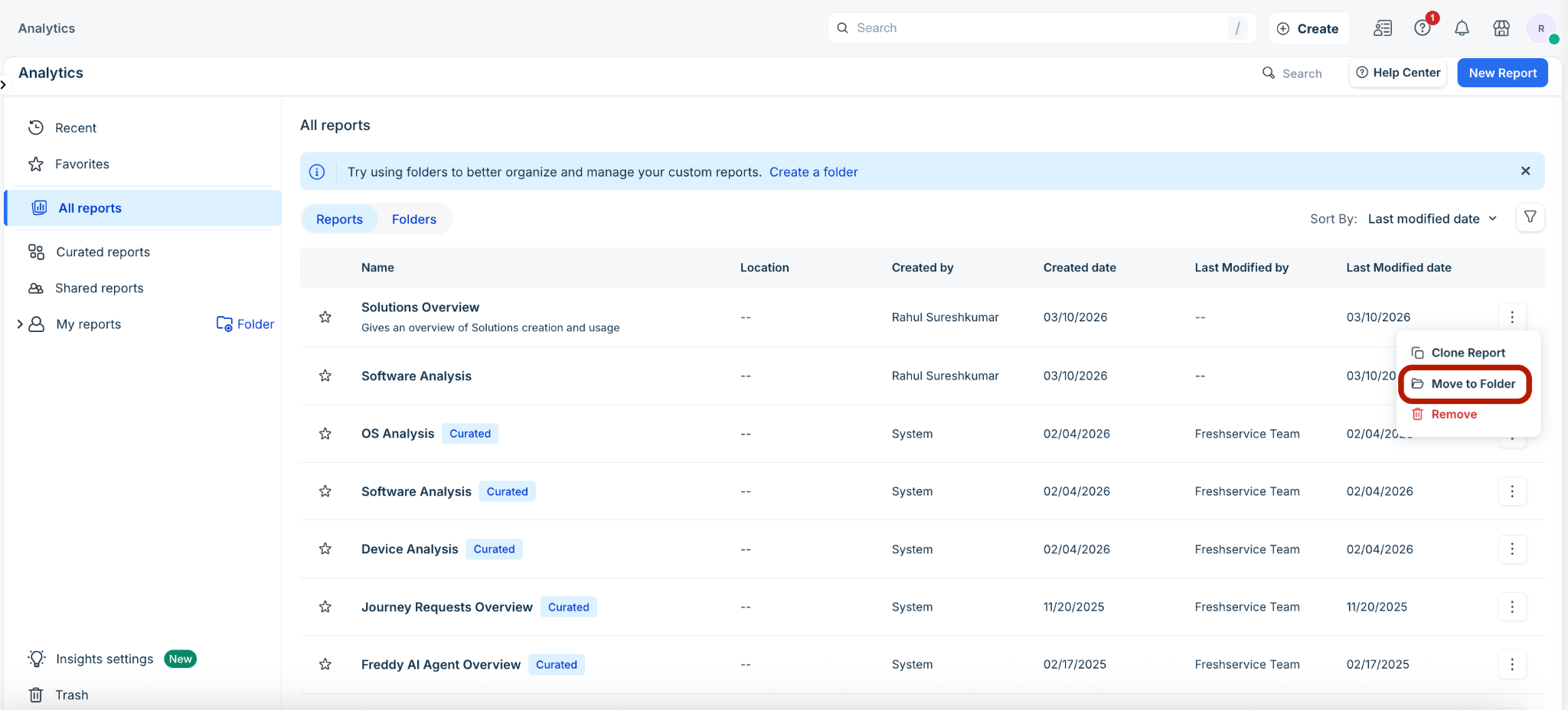 Click the ellipsis icon next to a report, and select Move to Folder.