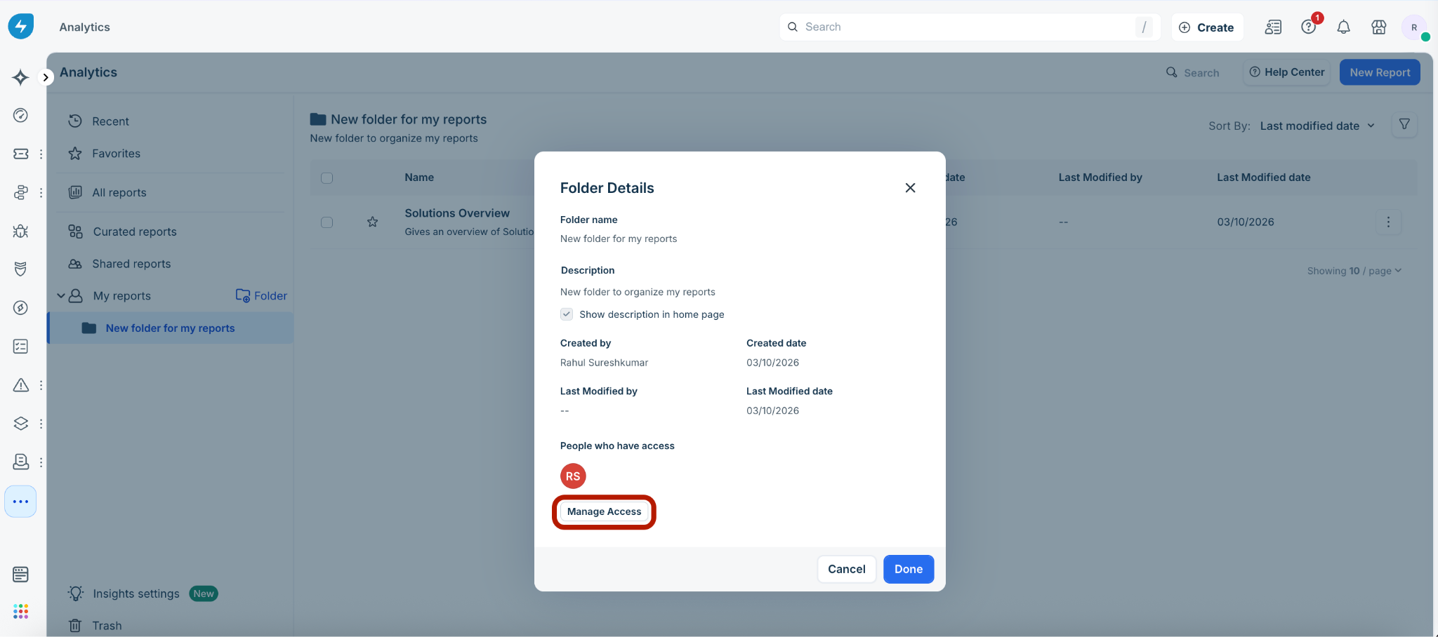 Note: You can also manage folder sharing access with the Manage sharing option available under the ellipsis icon next to a folder. See Share folders for Analytics reports for more information.