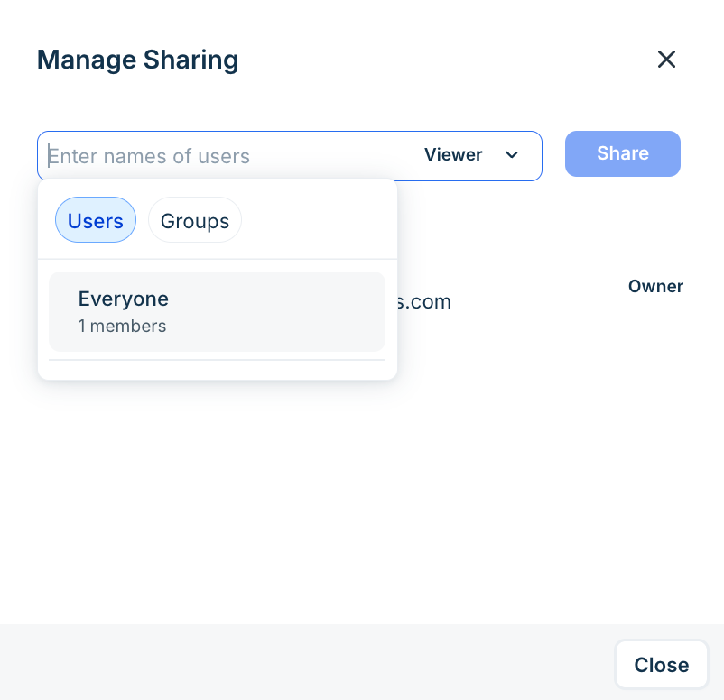 In the Manage Sharing dialog, search and select the relevant Users or Groups from the search field.