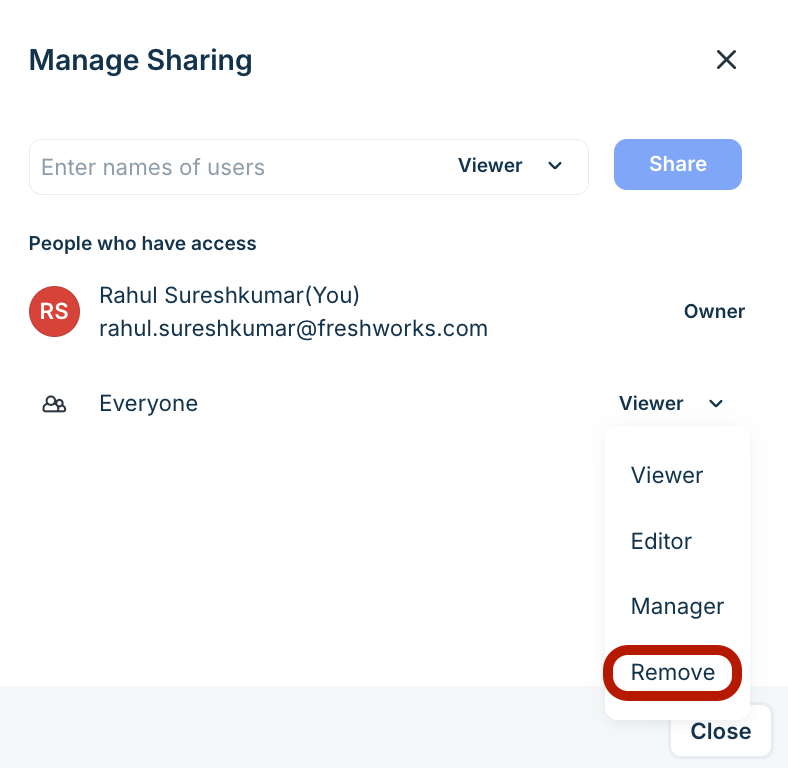 In the Manage Sharing dialog, click the permissions dropdown next to a user or group you want to remove. Then, click Remove.