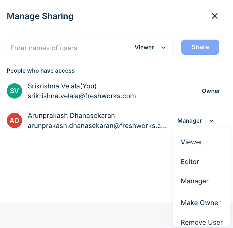 3. In the Manage Sharing dialog, click the dropdown next to a user’s name.