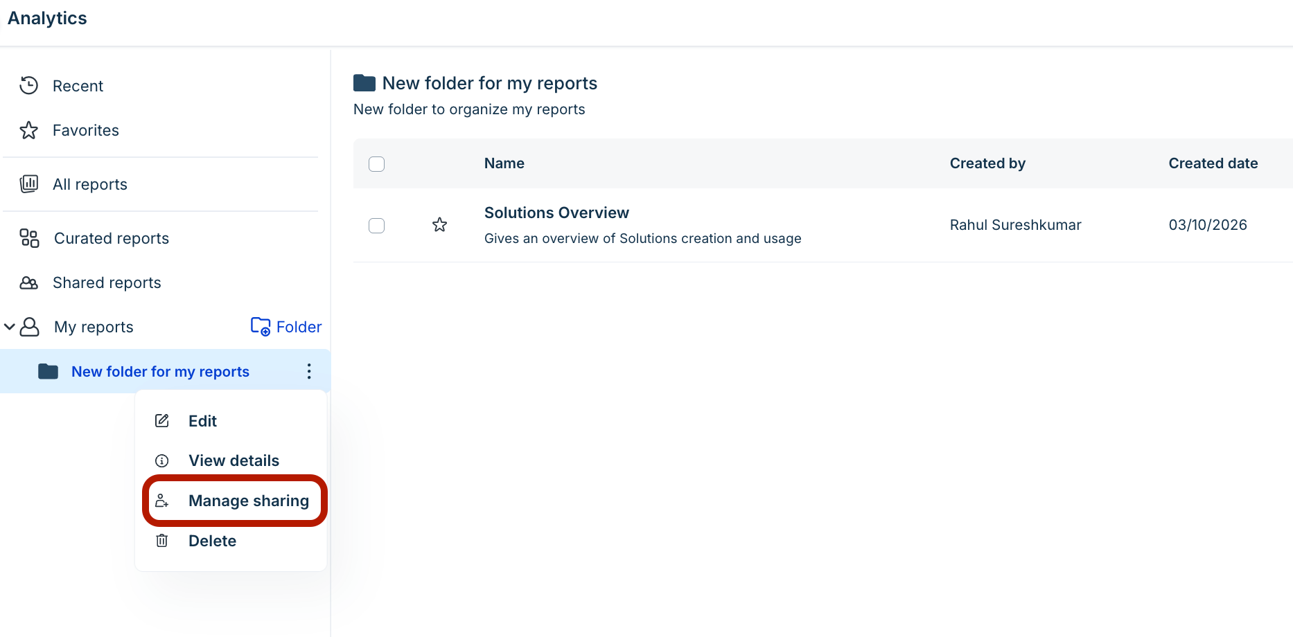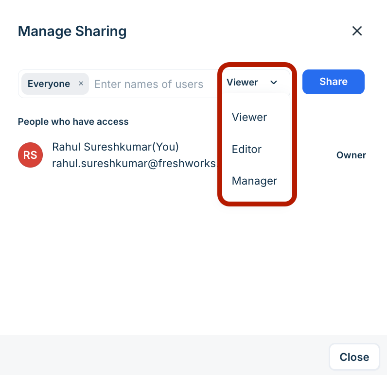You can share a folder with your peers instead of sharing reports in bulk. While sharing a folder, you can set different access levels for the users, such as Viewer, Editor, or Manager. The folders can be shared with others individually or in groups. The folder you shared will be visible under Shared reports/Shared with me for the collaborator.